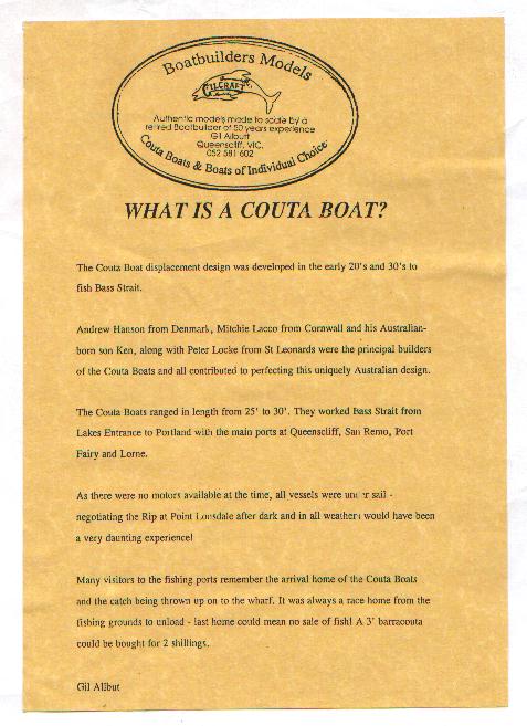 ![]() Couta Boat These boats are scale models of the Queenscliff Couta Boat called the Dawn, built by Peter Lock Queenscliff in date. |